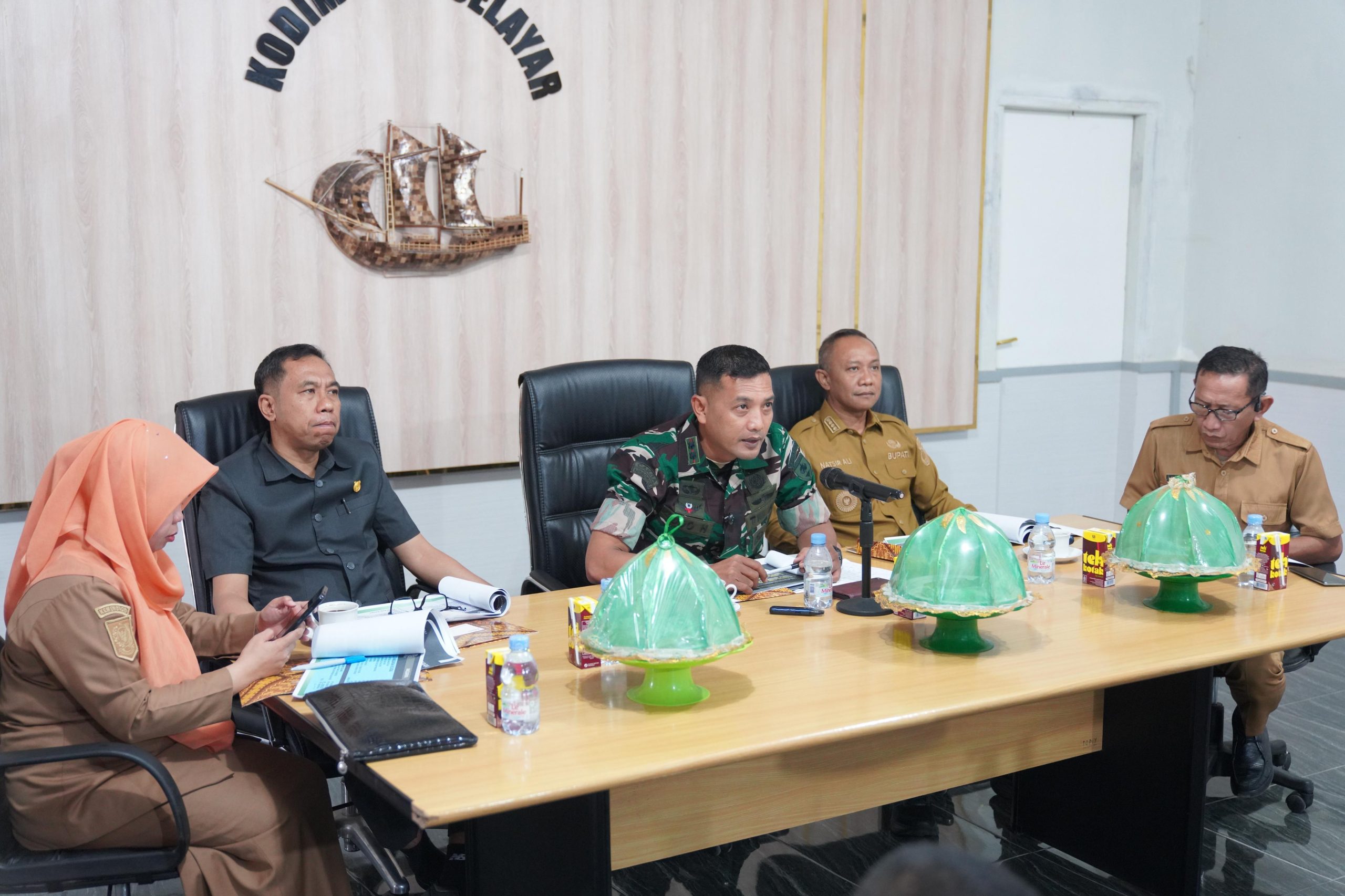 KEPULAUAN SELAYAR – Bupati Kepulauan Selayar, Muhammad Natsir Ali bersama Komandan Kodim (Dandim) 1415/Selayar, Letkol Czi Yudo Harianto, ST., mengikuti pertemuan bersama Kepala Staf Kodam (Kasdam) XIV/Hasanuddin, Brigjen TNI Sugeng Hartono, yang berlangsung di ruang rapat Makodim 1415/Selayar, Jalan Kelapa Benteng, Senin (6/4/2026).